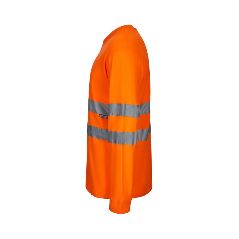 Maille piquée. 2 bandes réfléchissantes horizontales aux manches et sur le corps. Doubles coutures. Conforme à la certification EN20471 Classe 2.