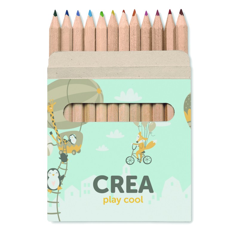 Set de 12 crayons de couleur dans une boîte en carton recyclé naturel.
