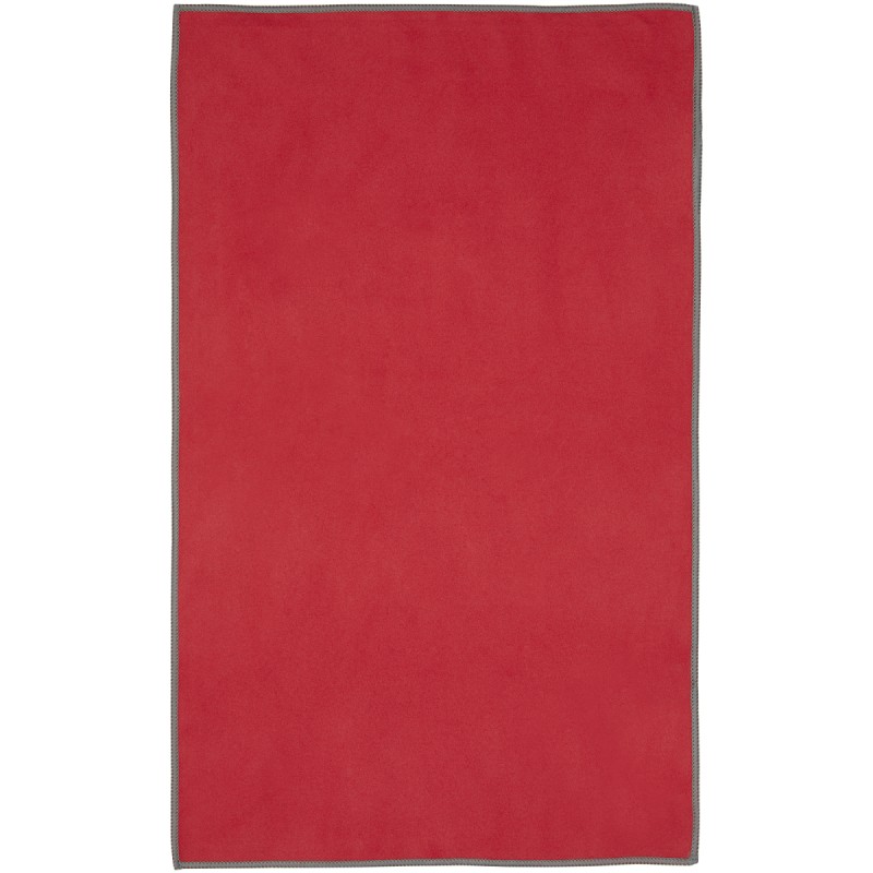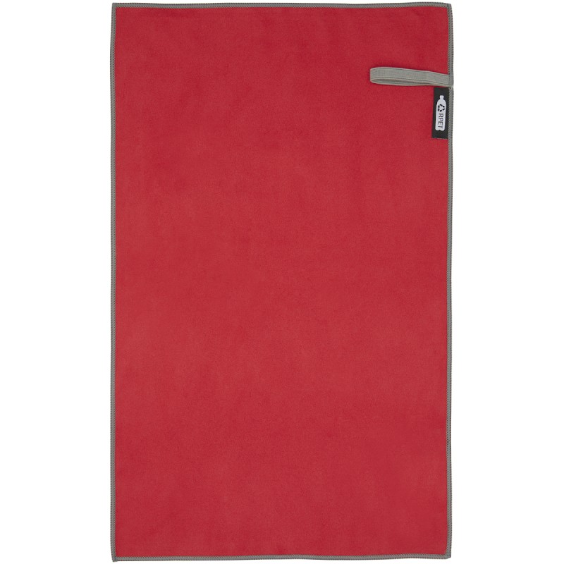 La serviette de sport Pieter absorbe très bien, est légère, sèche rapidement et le tissu est durable et extrêmement doux. Lorsque la serviette est pliée et fixée à l'aide de l'élastique, elle est réduite à une petite taille, ce qui permet de l'emmener à la salle de sport, à la piscine, ou de l'utiliser en randonnée ou en camping. D'une taille de 50 x 30 cm, la serviette est composée à 90 % de polyester recyclé certifié GRS et à 10 % de nylon. Elle peut être lavée en machine à 40 °C. Livrée avec une pochette de rangement (15,5 x 10 cm) en plastique PET recyclé, qui offre une surface idéale pour l'impression d'un logo.