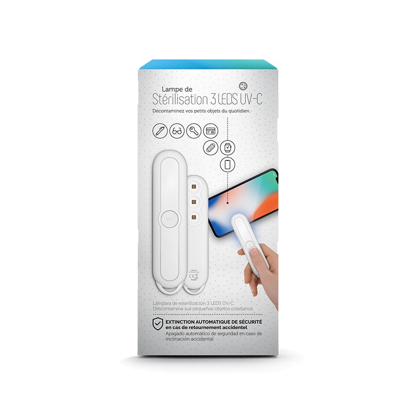 Cette lampe de stérilisation compacte et portable avec 3 LEDS UV-C éliminera 99% des virus, germes et bactéries de votre environnement quotidien. Vos yeux seront protégés grâce à l’extinction automatique de sécurité en cas de retournement accidentel. Fonctionne sur batterie 400 mAh rechargeable sur câble USB fourni. Livrée en boîte individuelle illustrée. Marquage en 1 couleur, Quadri-Numérique ou Quadri-Numérique Nominatif.