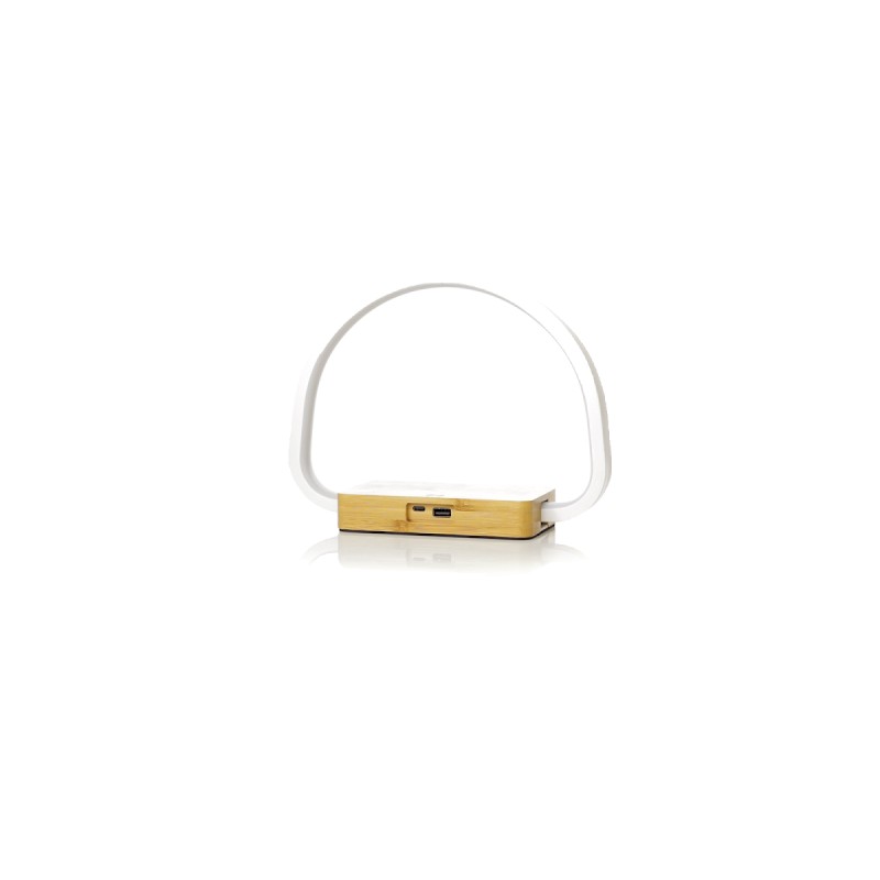 Lampe chargeur éco design. Fabriqué en bambou de coupes naturelles et avec une base antidérapante. Chargeur sans fil 10W intégré. Il comprend 52 LED et 3 positions d'éclairage (chaud, froid et moyen), avec une intensité lumineuse réglable. Compatible avec les appareils mobiles de chargement sans fil et la connexion USB. Il comprend un câble de recharge Type C et est présenté dans un joli coffret éco-conçu. Manuel d'instruction disponible en espagnol et en anglais.