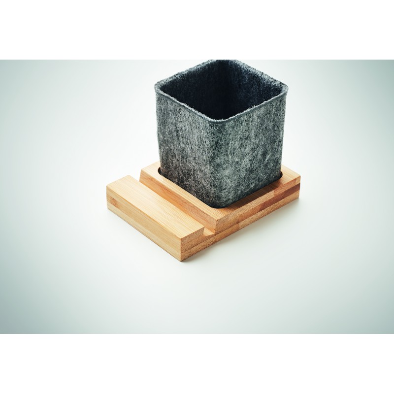 Pot à crayons en feutre RPET avec base en bambou et support pour téléphone portable.